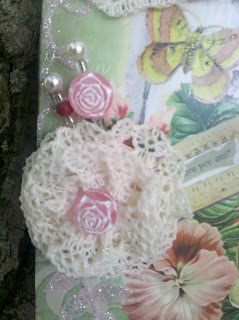 I also added a little to the card with some trim and leaves that are glittered. They used to be borders, but I cut them up to fit the way I wanted. This is more vintage lace that I used from my grandmothers stash. I have tons of it and I love it. It's the perfect size!!